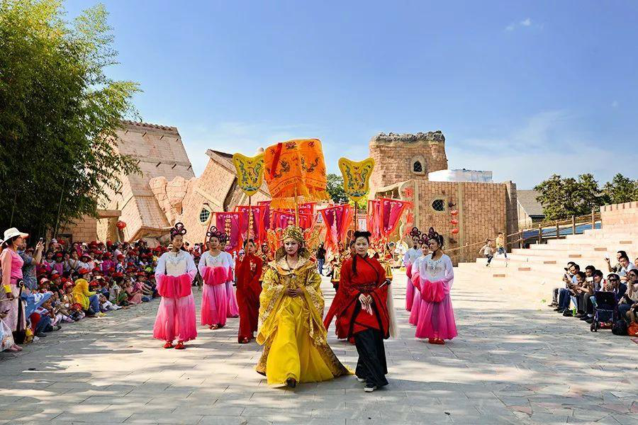 西游记公园实景演出。这里有来自俄罗斯、哈萨克斯坦和新疆等多个民族组成的百国艺术团纵情歌舞,巡游狂欢;这里有历史气息浓厚的女王登基大典,礼炮齐鸣,文武百官朝拜,各国使者觐见,并奉上特色歌舞,标志了各民族之间友好往来。