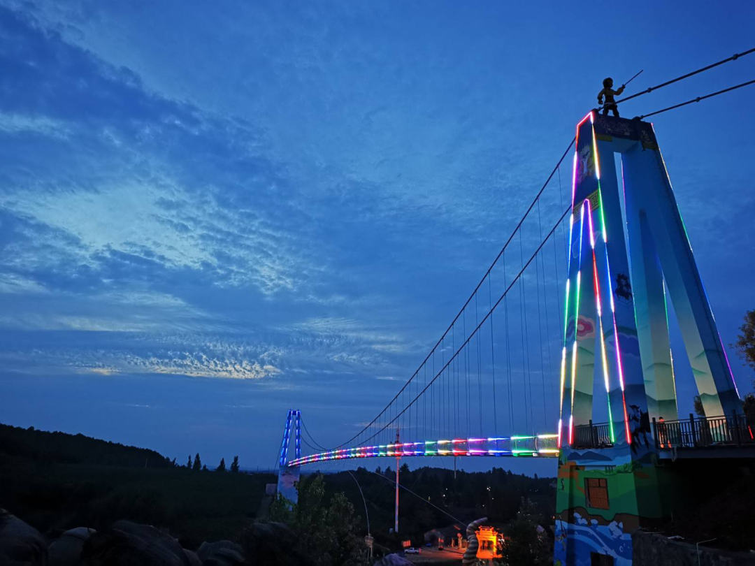 西游记公园凌云渡玻璃桥。玻璃桥通过艺术的外观设计和夜晚绚丽多彩的灯光效果,为公园增加了一个亮丽多彩的视觉艺术新景观,成为景区西游之夜的又一标志性建筑。凌云渡玻璃桥作为全国第一家夜光主题文化玻璃桥,华中地区首家西游记主题体验桥,首创的夜光玻璃桥可以鸟瞰整个西游记主题乐园的夜景,感受7D玻璃桥西游记主题情景,身临其境,异域风情浓厚。从桥下往上看,桥上的灯光像波浪一样,在桥上像流云般地涌动,忽明忽亮,忽快忽慢,忽彩忽淡,灯火璀璨,五彩缤纷,灿若星河,流光溢彩,五光十色。