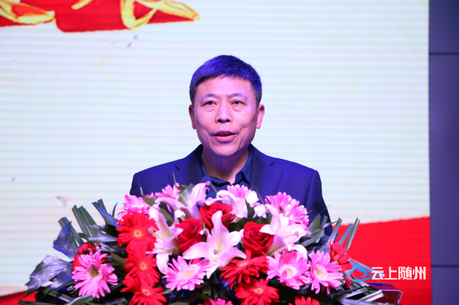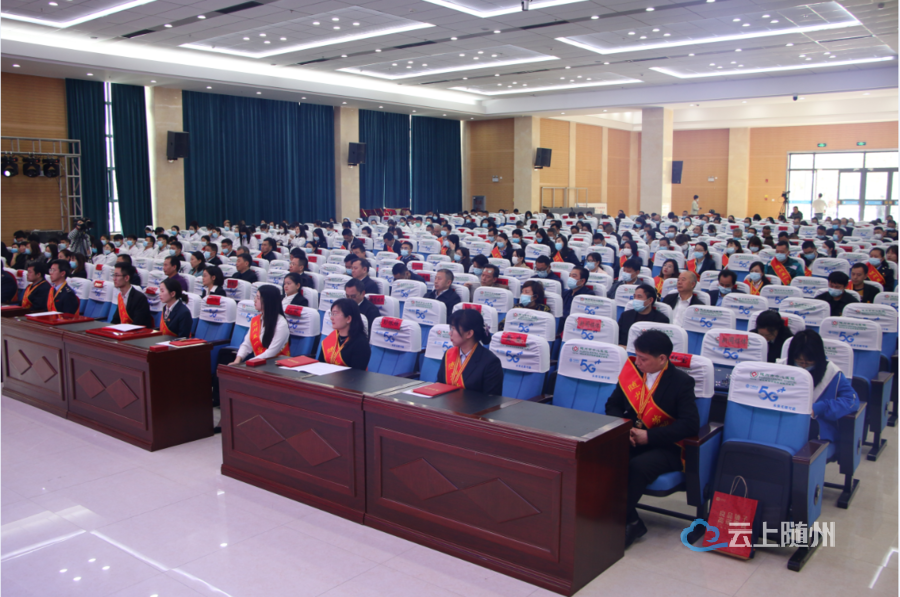 庆祝建党100周年成立的“学党史、讲奉献、促发展”随州市劳模(职工)宣讲团成员接受授旗和聘书。
