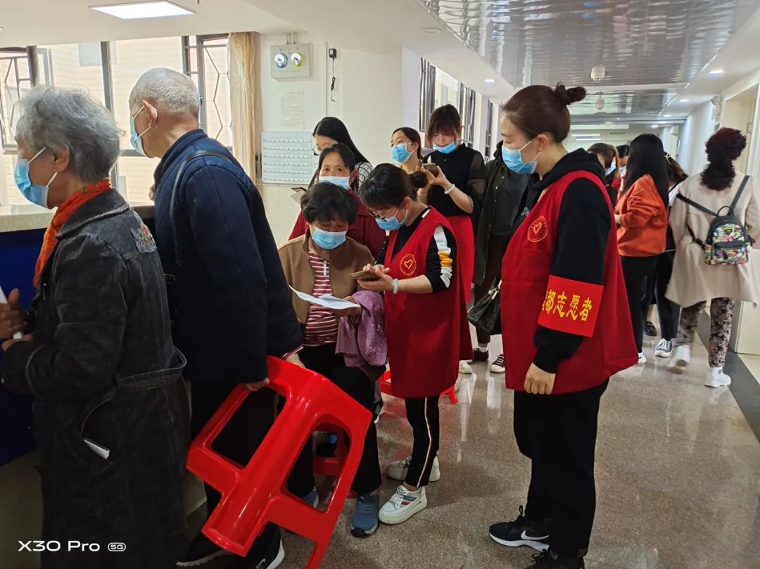 4月29日,西城街道飞来土社区组织下沉党员,在曾都医院社区服务卫生站开展通知居民接种疫苗、现场维持秩序、引导居民微信扫码网上预约登记等服务工作。(杨素娟)