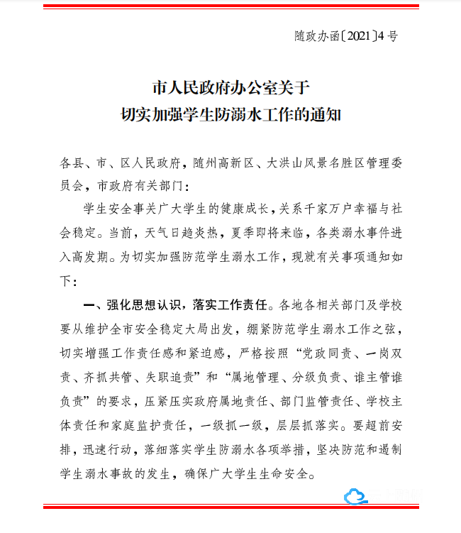 气温升高 溺水事故进入高发期 为守护学生生命安全 随州市人民政府办公室 发布关于切实加强学生防溺水工作的通知 ↓↓↓ 预防溺水事故,我们需要做什么? 赶快来看看吧! 编辑:严晨菲 责编:钱思雪 审核:陈凡 鲁京京