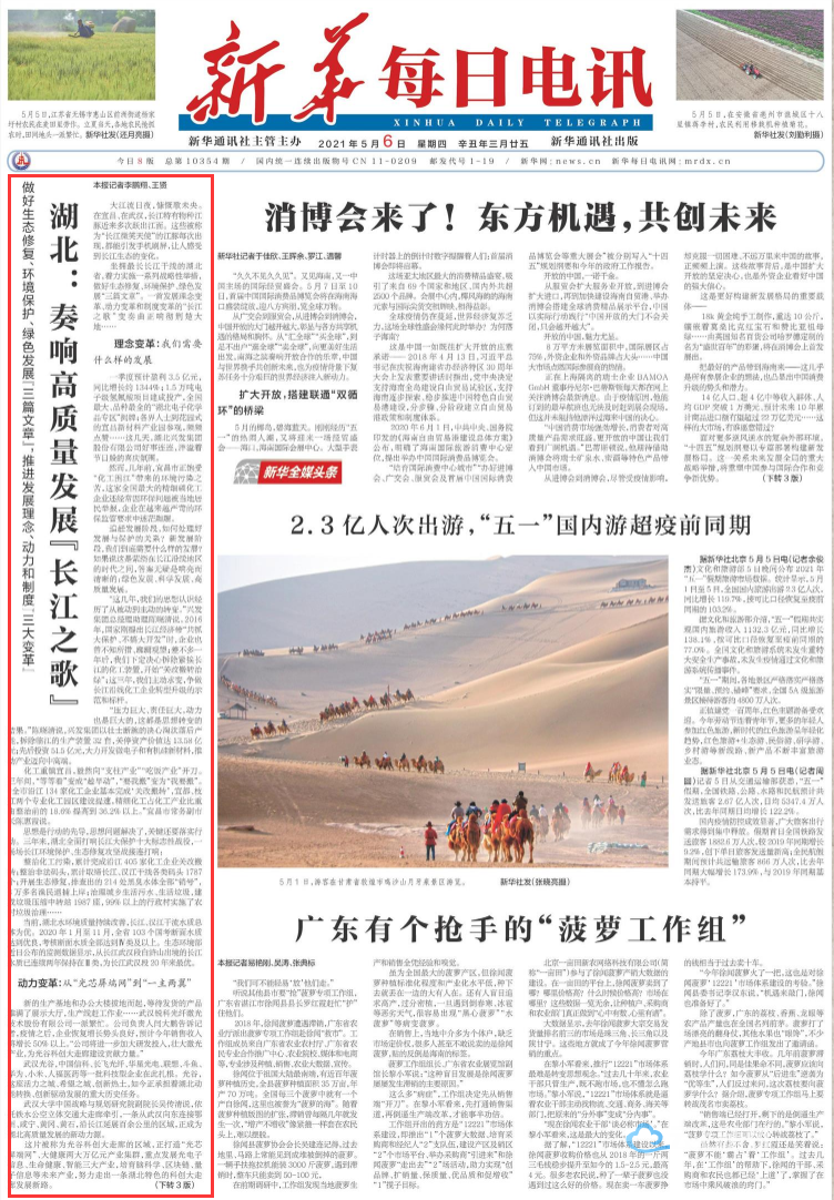 今日,《新华每日电讯》头版刊发《湖北:奏响高质量发展“长江之歌”》,聚焦湖北做好生态修复、环境保护、绿色发展“三篇文章”,推进发展理念、动力和制度“三大变革”。