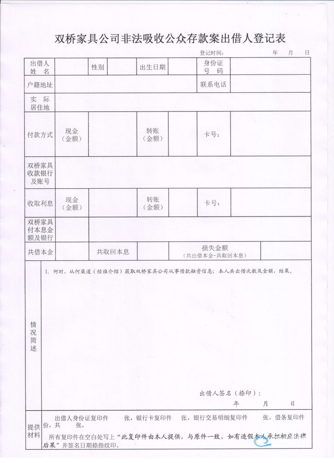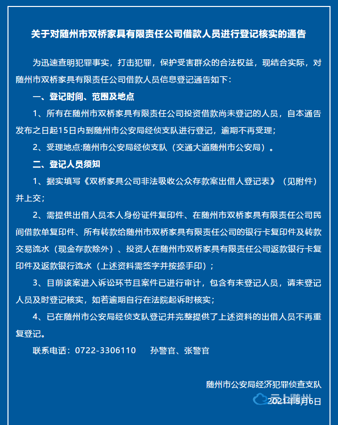 关于对随州市双桥家具有限责任公司借款人员进行登记核实的通告