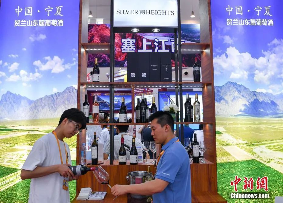 图为来自贺兰山东麓的银色高地酒庄葡萄酒在宁夏馆展出。中新社记者 崔楠 摄
