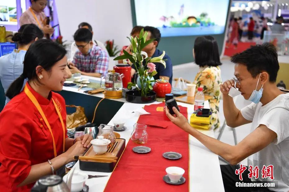 图为参观者在福建馆品尝武夷岩茶。中新社记者 崔楠 摄