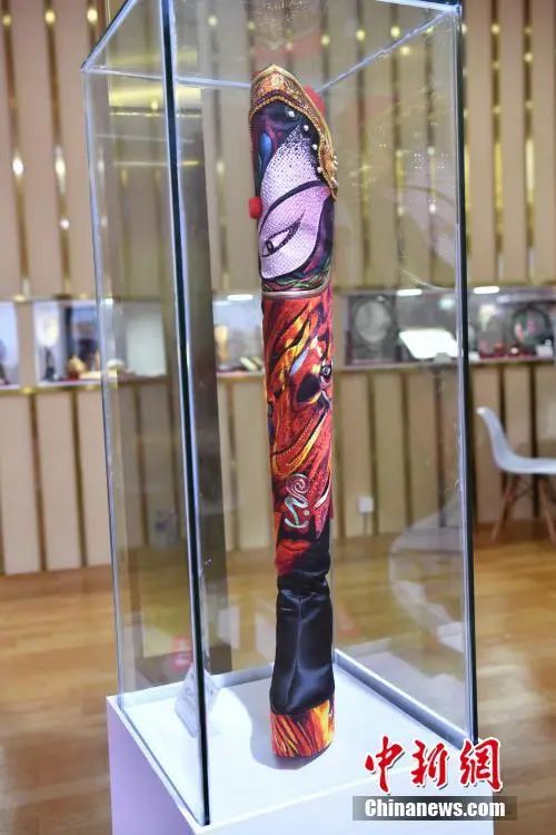 图为四川馆展示的川剧脸谱主题长靴。中新社记者 崔楠 摄