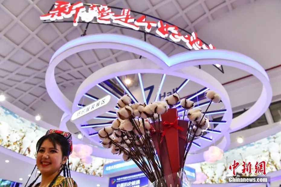 新疆展区以享誉世界的新疆棉花作为主要设计素材,在展示新疆纺织服装、农产品、食品、红酒、珠宝玉器、文化创意、医疗医药等特色优势产业的同时,通过声、光、电等方式,呈现繁荣美丽的新疆形象。