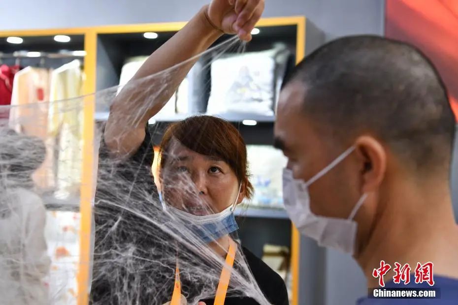 图为江苏馆一参展商现场拉起其使用的蚕丝原料证明自家产品质量优异。中新社记者 崔楠 摄