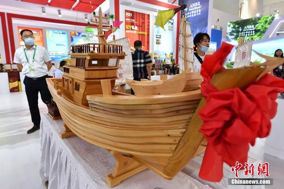 图为辽宁馆中展出的盘锦远航船厂制作的木制船模。中新社记者 崔楠 摄