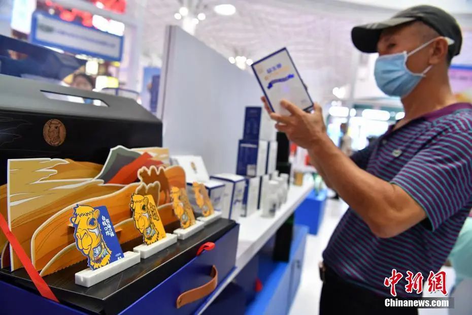 图为内蒙古馆展出的骆驼奶粉受到参观者关注。中新社记者 崔楠 摄