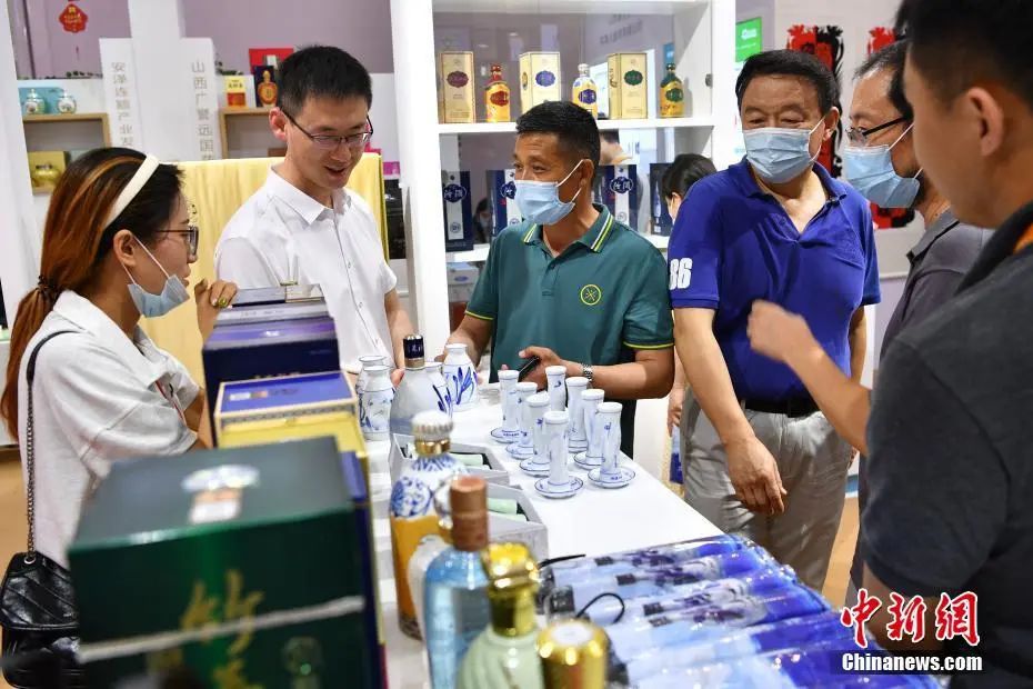 图为参观者在山西馆了解汾酒相关产品。中新社记者 崔楠 摄