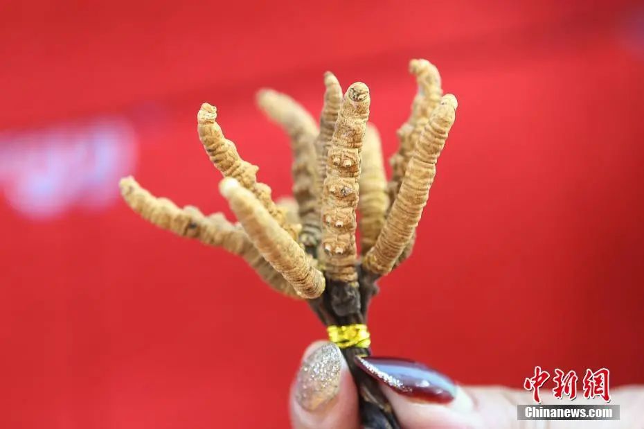 图为青海馆展示的来自玉树的冬虫夏草。中新社记者 崔楠 摄