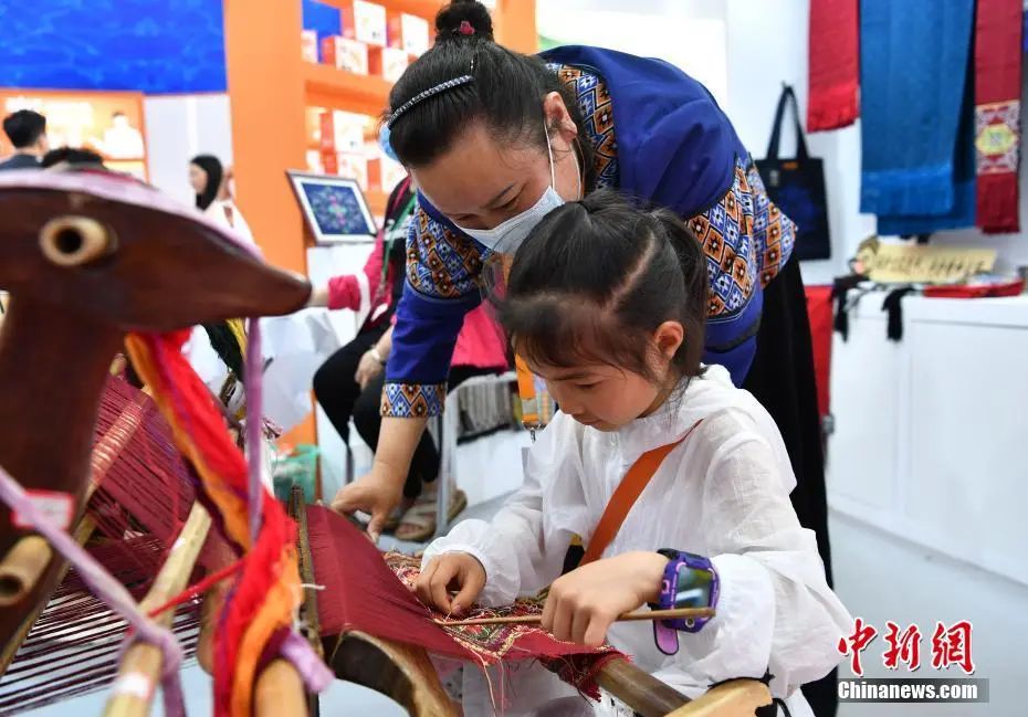 图为小朋友在湖南馆体验土家族传统织布技艺。中新社记者 崔楠 摄