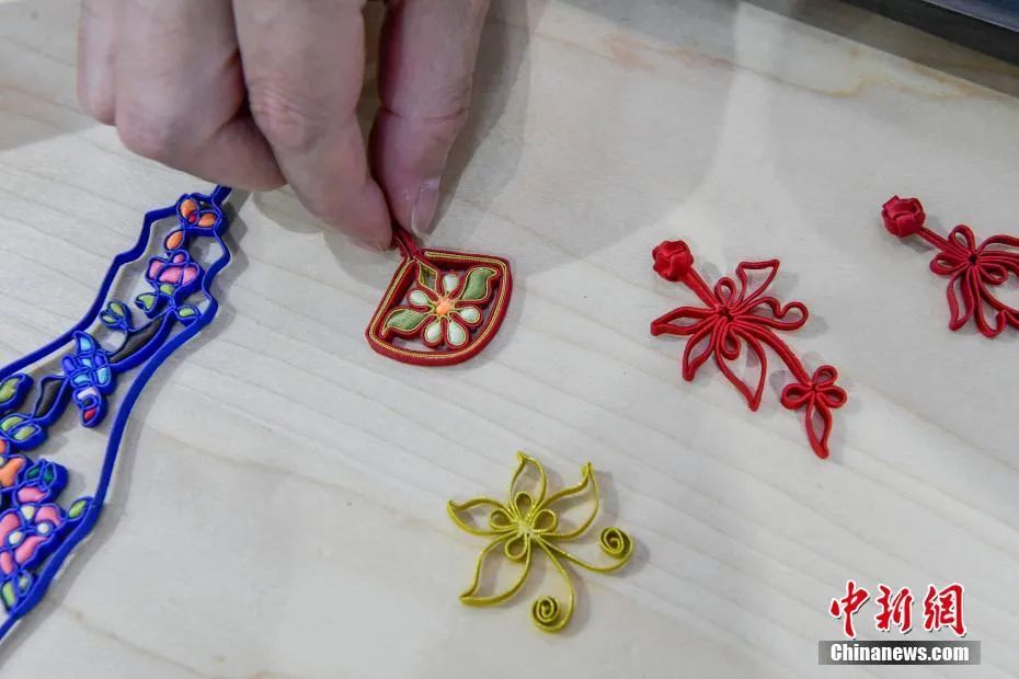 图为龙凤旗袍第四代传承人江满宗展示精美的旗袍盘扣。中新社记者 骆云飞 摄
