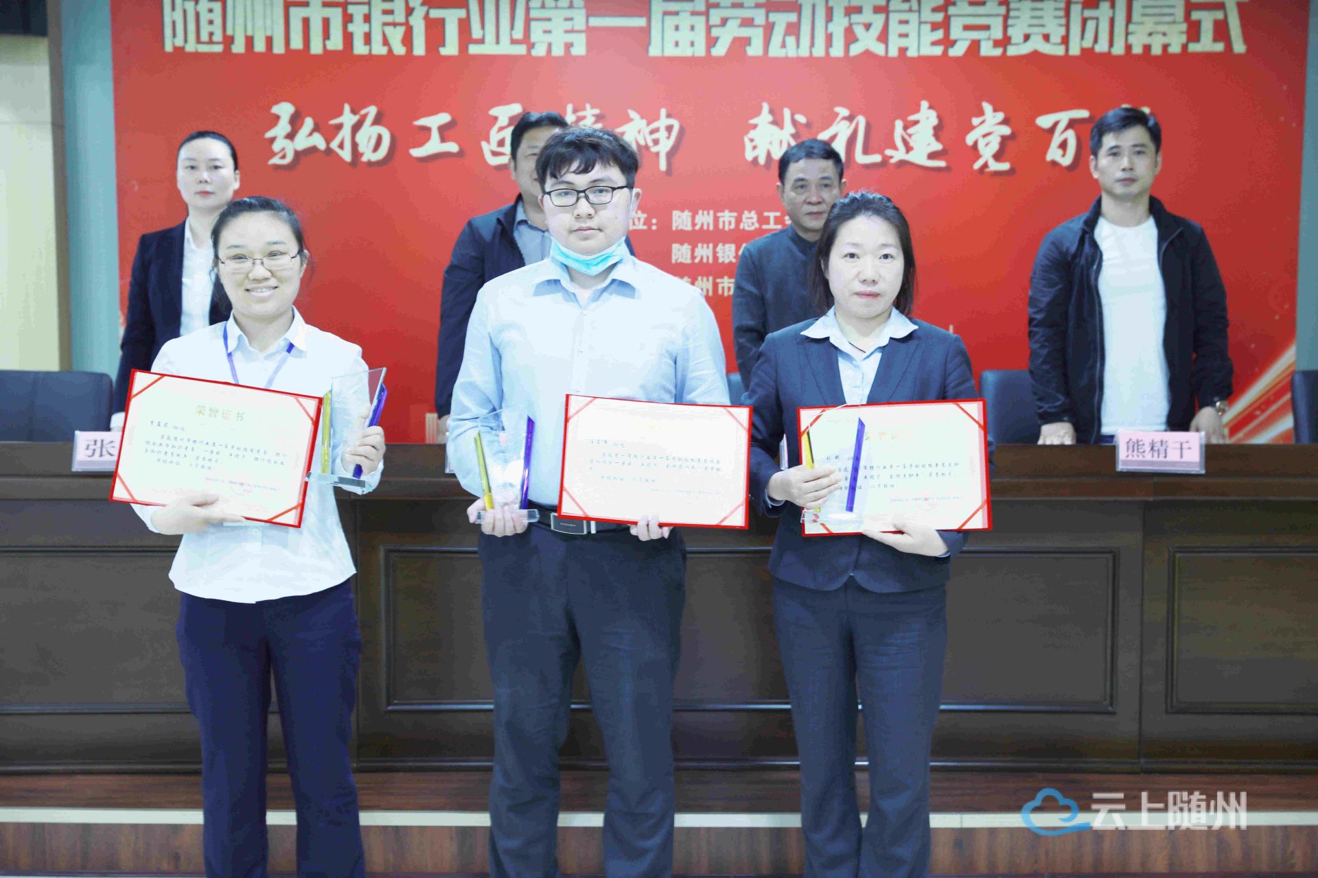 市农行汪宏伟、市农行刘艳、广水农商行李孟君3名选手分别获传票录入、点钞、银行综合业务知识竞赛一等奖荣誉,分别授予“金牌录入手”、“金牌点钞手”、“银行综合业务知识竞赛标兵”奖杯和一等奖荣誉证书,并推荐申报“随州市五一劳动奖章”。
