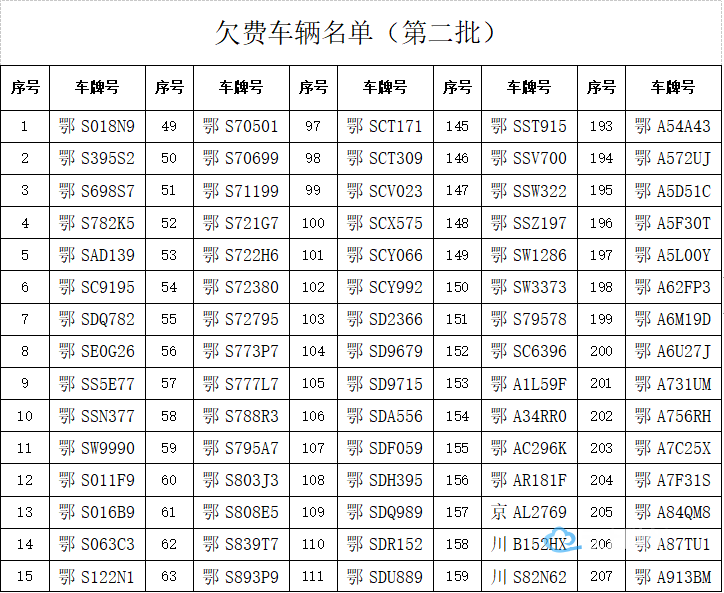 我公司现将欠费车辆信息(第二批)进行信息公示,为避免对车主的个人信用造成影响,请及时微信关注“随州智慧停车”公众号查询欠费记录并缴纳停车费用,按需停车。