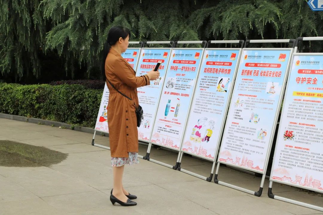 家住西城街道玉波门社区居民刘女士,在区市场监督管理局药品、化妆品安全知识展板前认真观看,并拿出手机将展板内容拍摄下来。她说:“化妆品每天都在用,以前都不知道化妆品选择方面还有这么多要注意的,我拍下来发个‘朋友圈’,让亲戚朋友都能了解。”