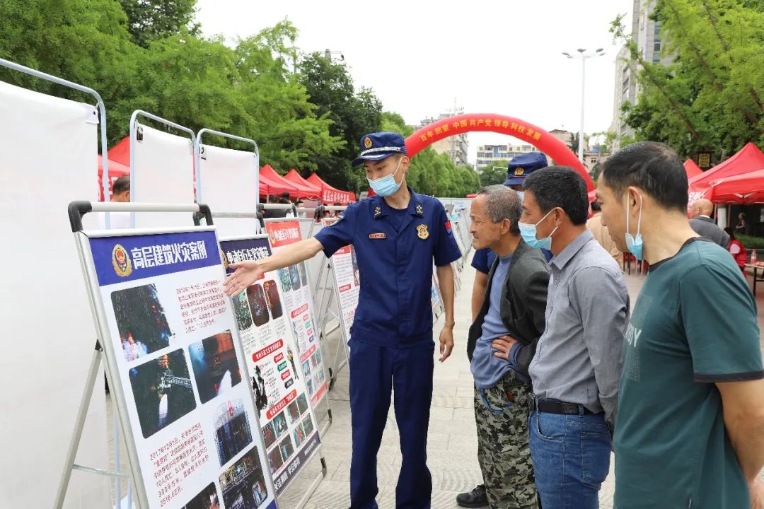 “电动自行车一定不要‘飞线’充电,高层建筑发生火灾逃生时切记不能搭乘电梯。”消防大队展板前,消防队员为观展市民讲解消防安全知识。