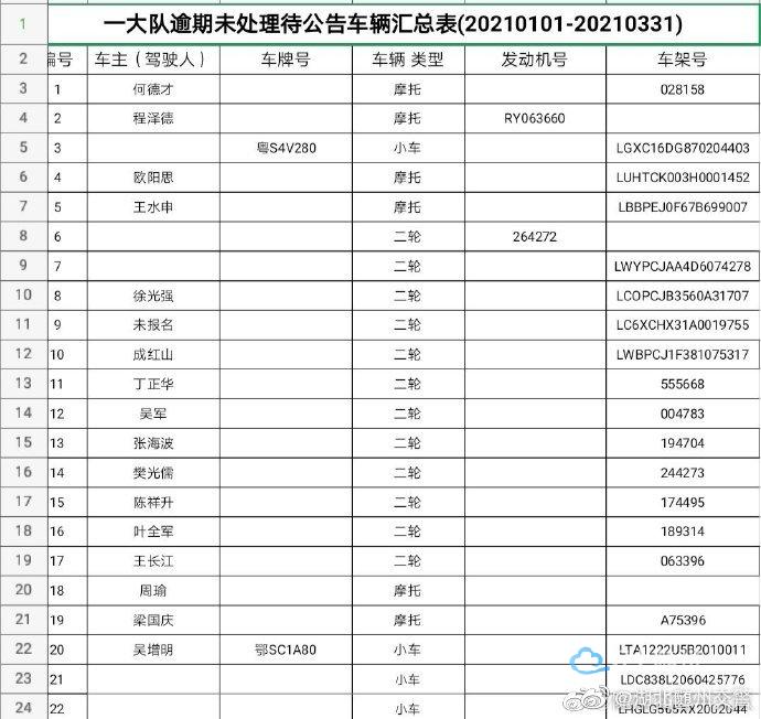 以下车辆在2021年1月1日至2021年3月31日期间因涉及道路交通违法,已被公安交通管理部门依法扣留,其驾驶人,所有人和管理人均未按规定期限到公安交通管理部门接受处理。根据《中华人民共和国道路交通安全法》第一百一十二条,《中华人民共和国道路交通安全法实施条例》第一百零七条等相关法律法规的规定,现予以公告。自本公告发布之日起经过三个月,当事人仍不前来接受处理的,公安交通管理部门将对扣留的车辆依法处理。