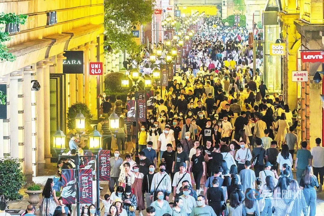 5月2日晚,前来汉街购物游玩的游人摩肩接踵,络绎不绝。(湖北日报全媒记者 梅涛 摄)