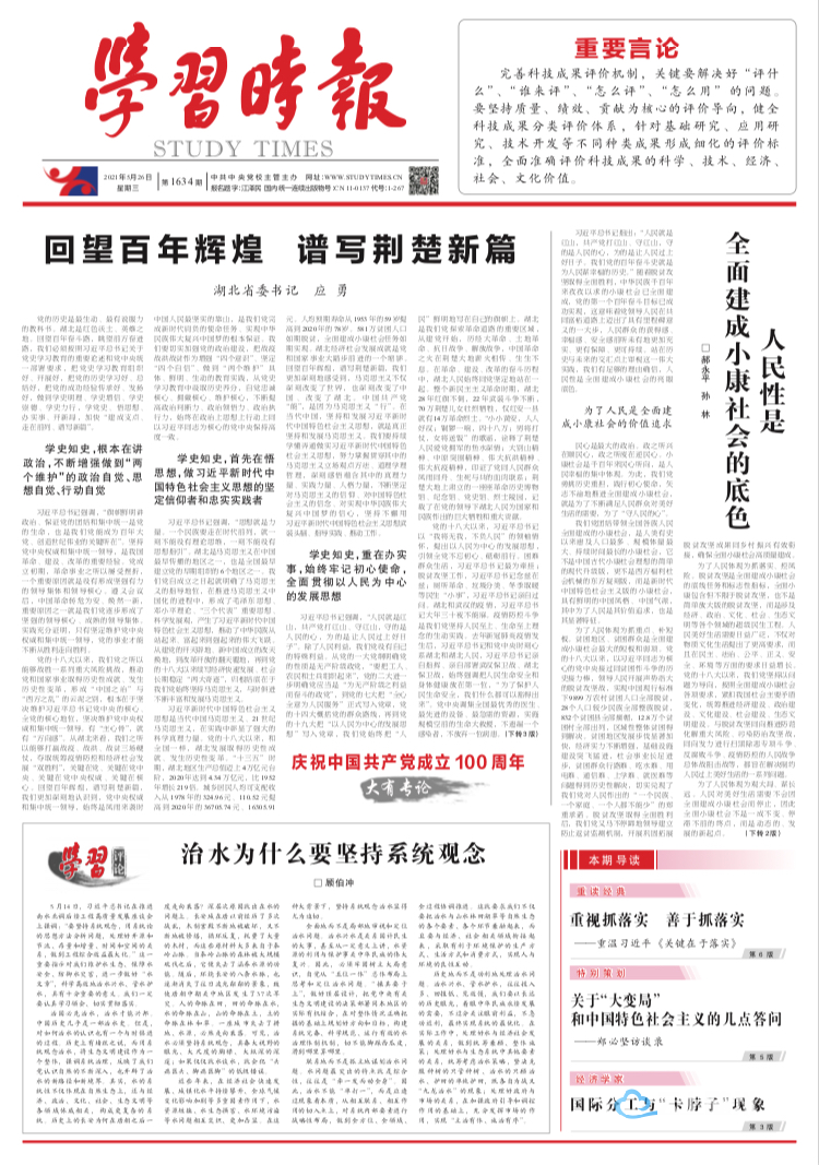 习近平总书记强调,“我们回顾历史,不是为了从成功中寻求慰藉,更不是为了躺在功劳簿上、为回避今天面临的困难和问题寻找借口,而是为了总结历史经验、把握历史规律,增强开拓前进的勇气和力量”。党的十八大以来,习近平总书记4次考察湖北,并参加十三届全国人大三次会议湖北代表团审议,发表一系列重要讲话,明确要求“努力把湖北建设成为中部地区崛起重要战略支点”“争取在转变经济发展方式上走在全国前列”“奋力谱写新时代湖北高质量发展新篇章”。回望百年辉煌,谱写荆楚新篇,就是要在党史学习教育中汲取丰厚滋养和前进动力,把学习党史同总结经验、观照现实、推动工作结合起来,把习近平总书记考察湖北、参加湖北代表团审议时的重要讲话精神作为湖北工作的“纲”和“魂”,主动作为、奋发有为、担当善为,全力以赴为湖北发展打基础、利长远、强功能、求实效。