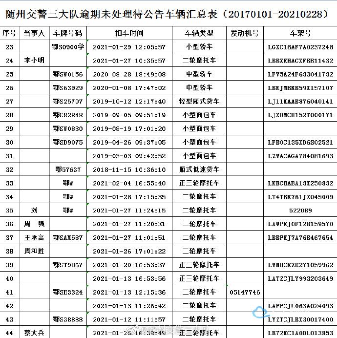 以下车辆在2017年01月01日至2021年02月28日期间因涉及道路交通违法,已被公安交通管理部门依法扣留,其驾驶人、所有人和管理人均未按规定期限到公安交通管理部门接受处理。根据《中华人民共和国道路交通安全法》第一百一十二条、《中华人民共和国道路交通安全法实施条例》第一百零七条等相关法律法规的规定,现予以公告。自本公告发布之日起经过三个月,当事人仍不前来接受处理的,公安交通管理部门将对扣留的车辆依法处理。