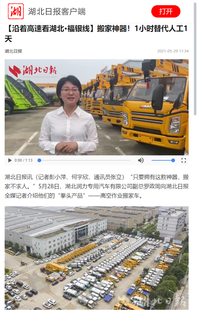 “只要拥有这款神器,搬家不求人。”5月28日,湖北润力专用汽车有限公司副总罗政周向记者介绍他们的“拳头产品”——高空作业搬家车。