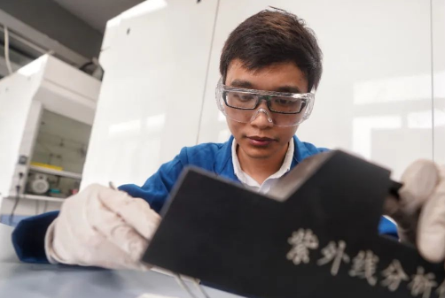 一片忙碌一身蓝色实验服、头戴护目镜的唐从辉