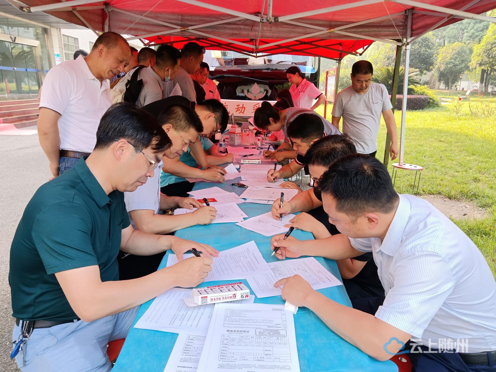 早上7点半,志愿者们都已早早来到指定地点做好了献血的准备工作。等到献血流动车到达公司大院,志愿者们井然有序的排好队伍,依次进行表格填写、登记、验血、抽血等工作。短短的半小时内,流动车旁已经排满了自愿献血的内部员工,食堂工作人员和安保人员也热情参与到此次活动中来。在此次献血人员中有些是从乡镇赶来的农村分局长,经过两个多小时的车程到达献血地点参与献血,正是有着这一份社会责任感以及个人人道主义风范,他们用行动证明对祖国和这个社会的热爱,是对建党一百周年的最好的献礼。