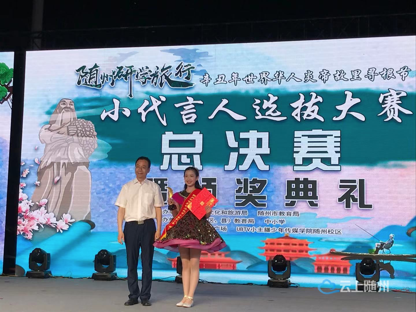 随州研学旅行小代言人选拔活动是今年寻根节“炎帝故里寻根之旅”研学旅行推介会系列活动之一。 6月1日晚,辛丑年世界华人炎帝故里寻根节“研学旅行小代言人选拔大赛”总决赛巅峰对决暨颁奖盛典在随州万达广场举行。经过激烈角逐,最终,随州市曾都区东关学校李睿涵获得辛丑年世界华人炎帝故里寻根节研学旅行小代言人大赛冠军。