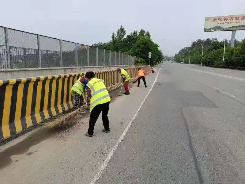 期间,累计出动人员800余人次,动用清扫车、铣刨机、摊铺机、压路机、运输车等160余台次,对炎帝大道、迎宾大道、G316东外环曾都境段路面进行经常性清扫,完成炎帝大道被交路口建设89个,修复破损路面12000余平方、维修水沟900余米,整修路肩、割草60余公里、清理边沟30余公里、清洗护栏10余公里、清理白色垃圾及树叶和沙土等3200余方、划设热熔标线7.5余公里,清理桥梁边坡及桥底杂物5座、桥梁伸缩缝泄水孔20余座,刷新迎宾大道桥梁隔离带2座、公里碑76 块、百米桩警示桩100余根。
