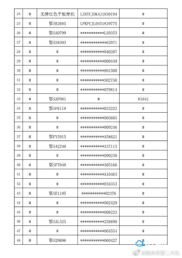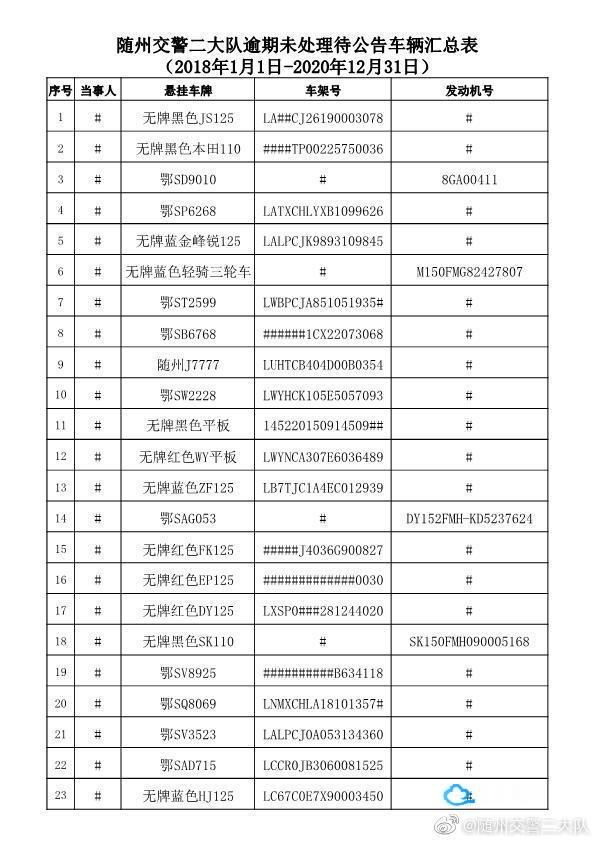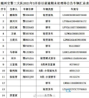 请以下车辆的驾驶人,所有人或管理人在本公告发布之日起三个月内携带身份证,驾驶证,行驶证或车辆合法来源证明到随州市公安局交通警察支队二大队接受处理。