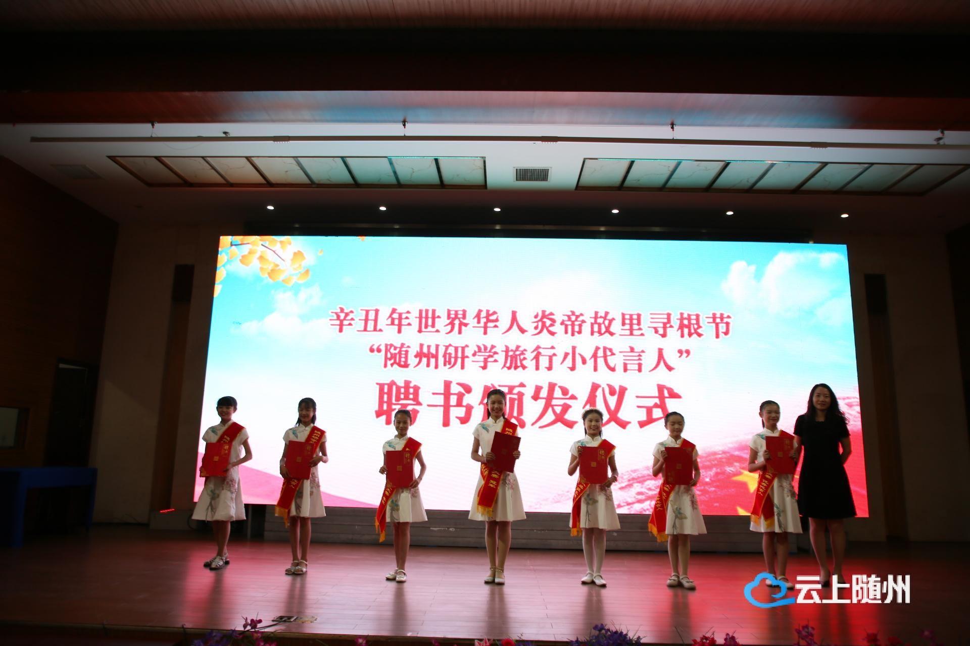 大会还颁发了“随州研学旅行宣传官”证书,并举行了辛丑年世界华人炎帝故里寻根节“随州研学旅行小代言人选拔大赛”颁奖仪式。大赛由随州市文化和旅游局、随州市教育局联合主办,历时一个半月,共有来自县市区的1300名学生参加了海选,经过层层筛选,最终7所学校中的7名学生脱颖而出,正式成为辛丑年世界华人炎帝故里寻根节“随州研学旅行小代言人”。此次活动的举办旨在喜迎“辛丑年世界华人炎帝故里寻根节”,同时也为了打造独具随州特色的研学旅游新名片,宣传和推介随州的文化旅游景区。