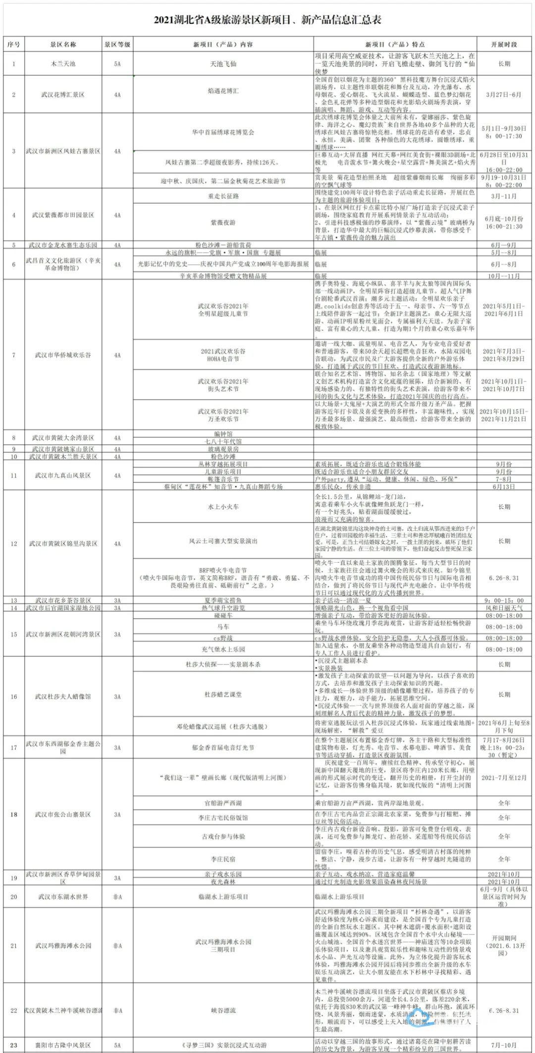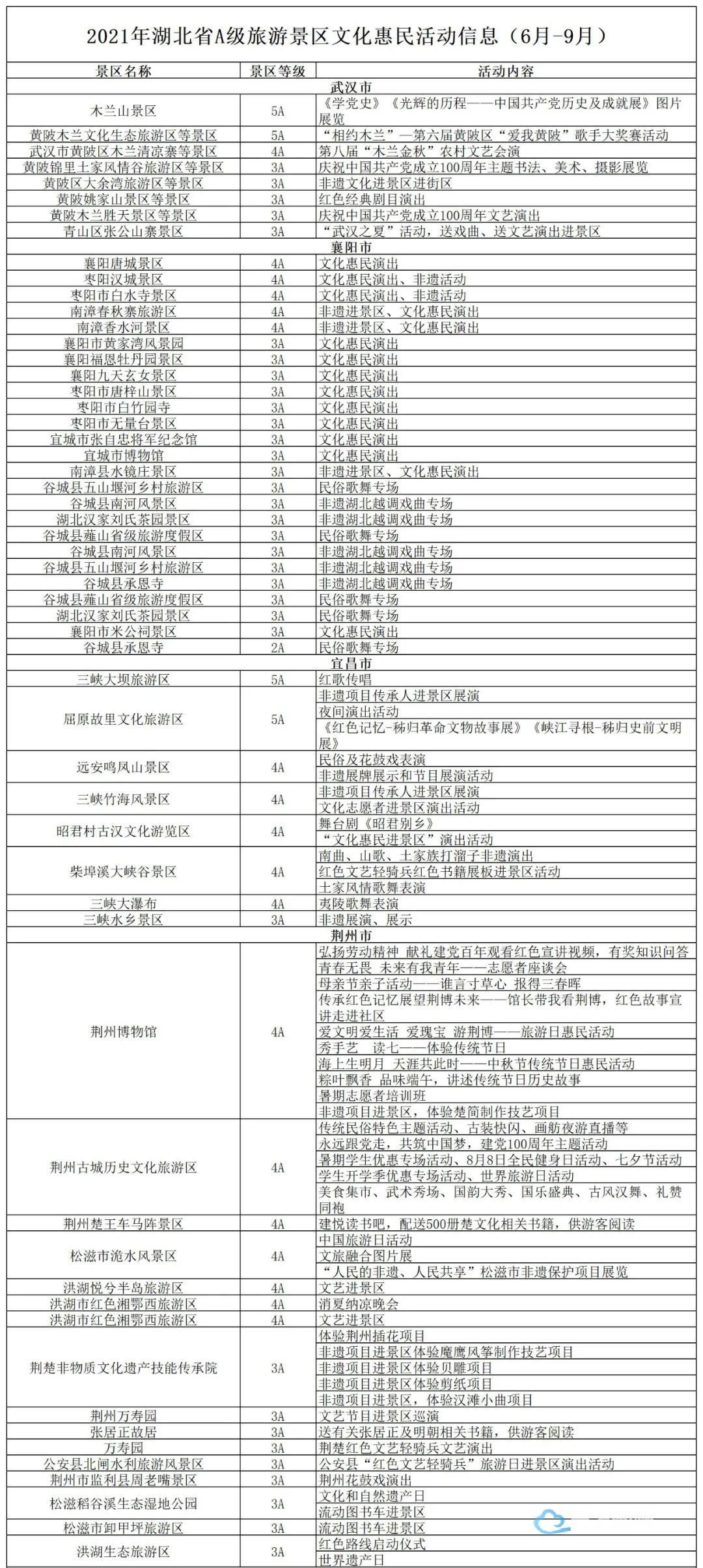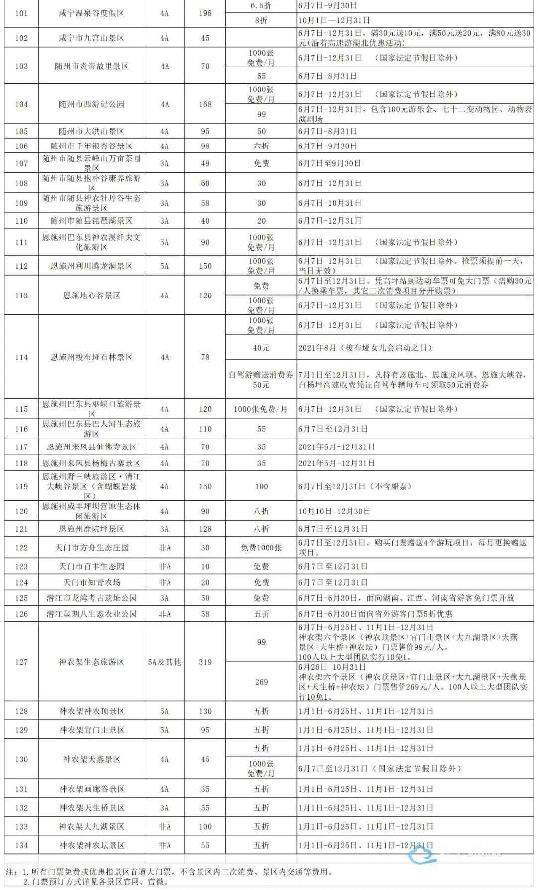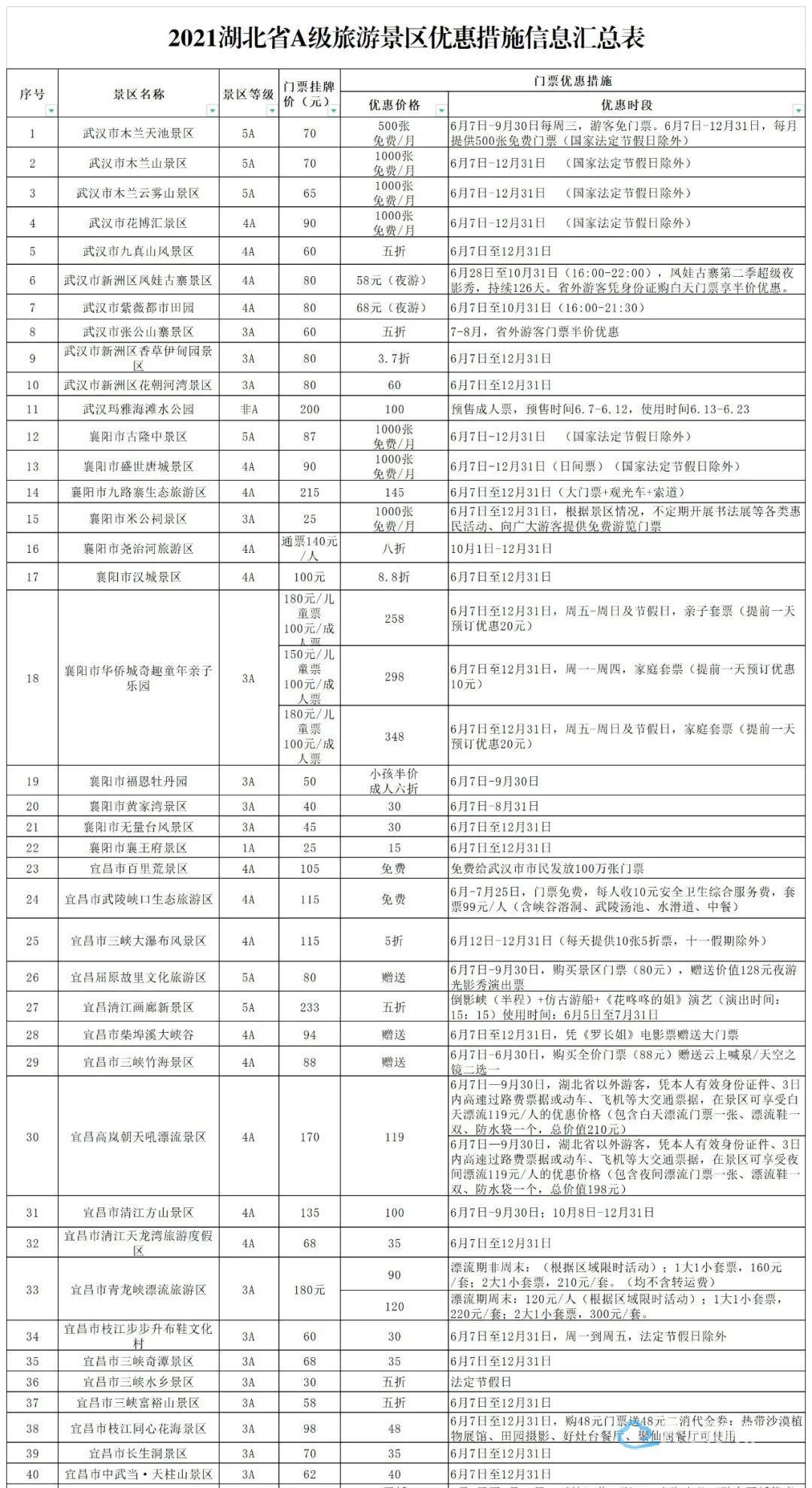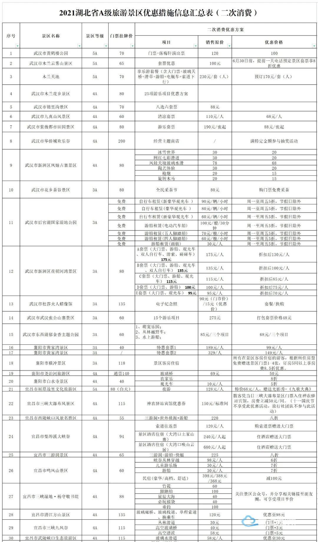 武汉黄陂木兰文化旅游区、襄阳古隆中景区、宜昌长阳清江画廊旅游度假区、恩施巴东神农溪纤夫文化旅游区、恩施利川腾龙洞景区等5A景区和18家热门4A景区每月提供免费门票1000张;