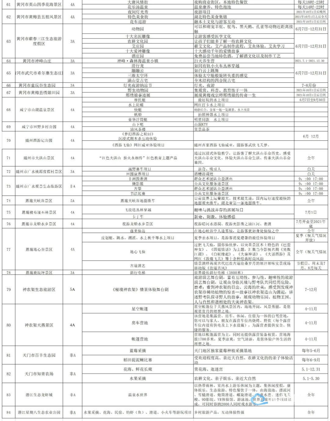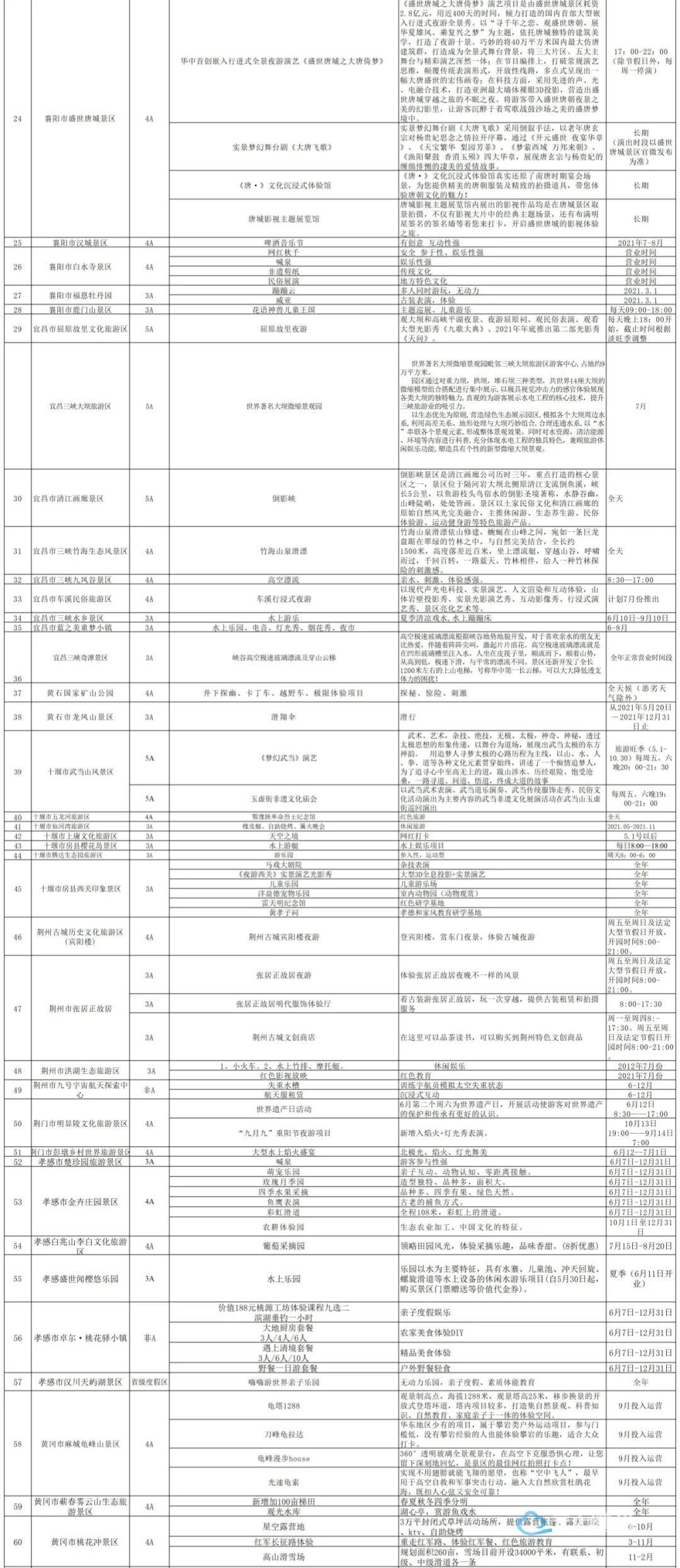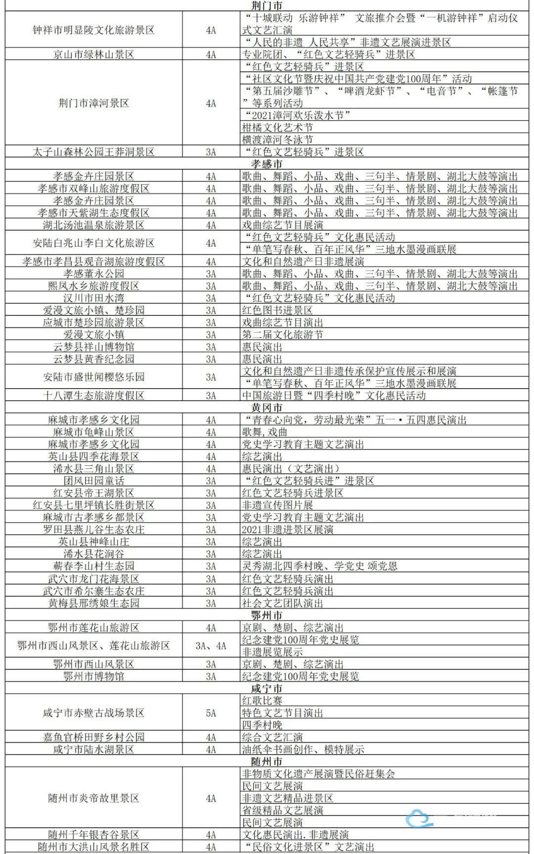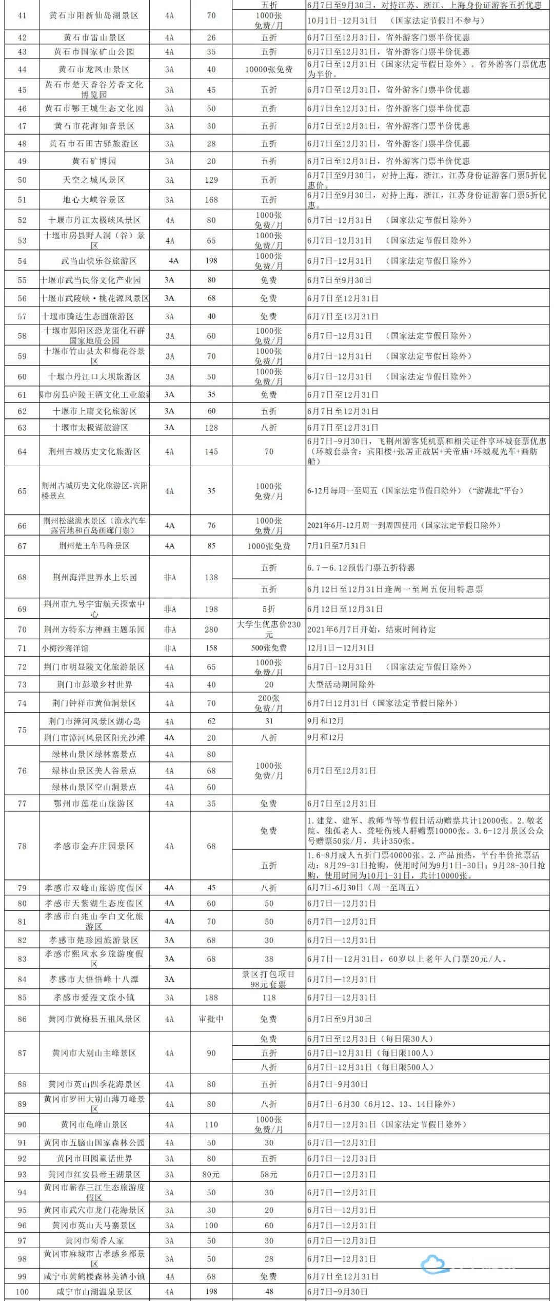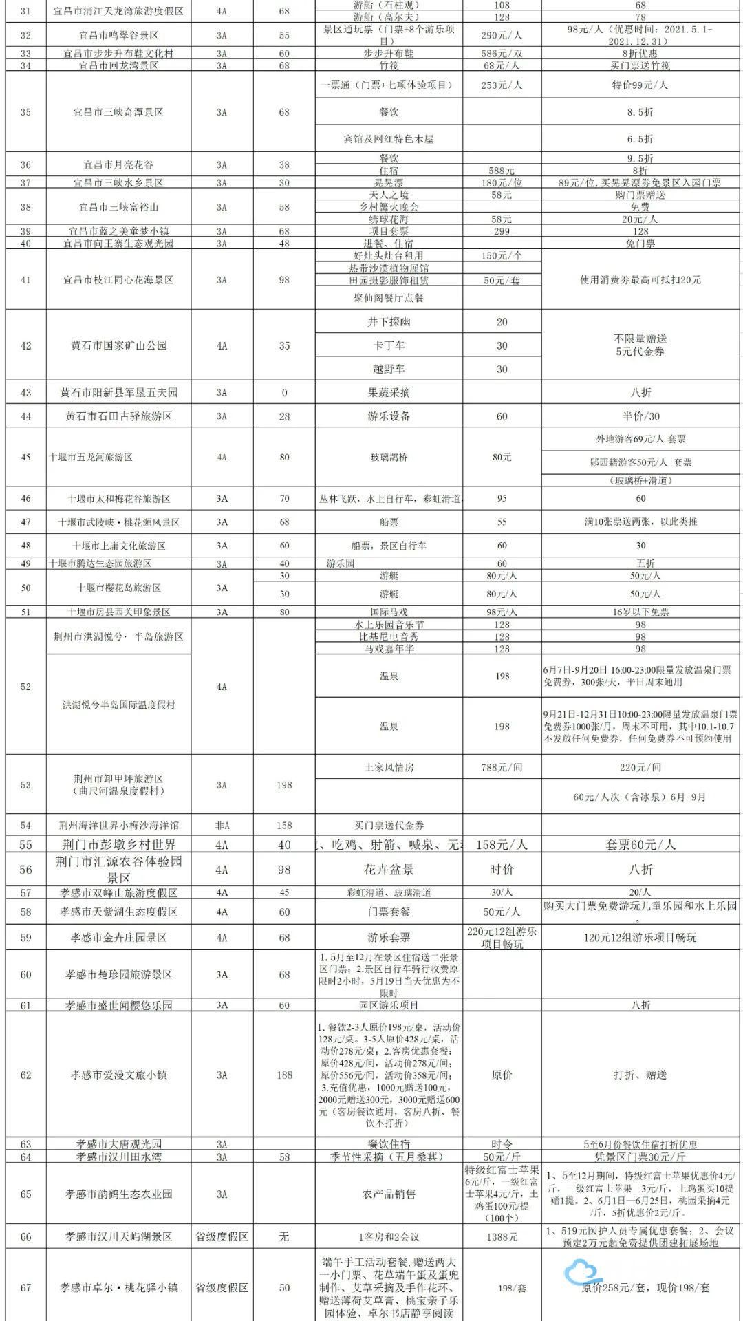 武汉黄陂木兰文化旅游区、襄阳古隆中景区、宜昌长阳清江画廊旅游度假区、恩施巴东神农溪纤夫文化旅游区、恩施利川腾龙洞景区等5A景区和18家热门4A景区每月提供免费门票1000张;