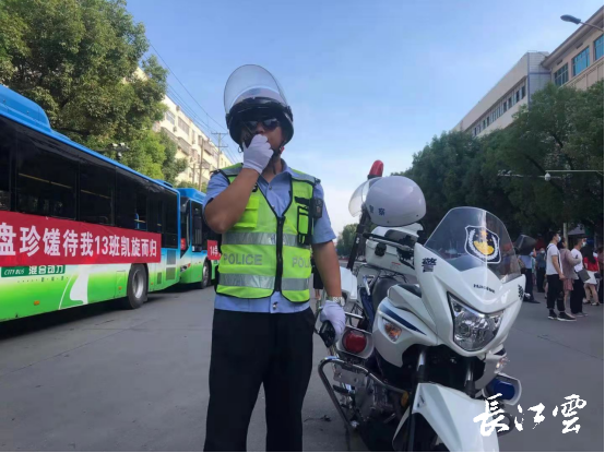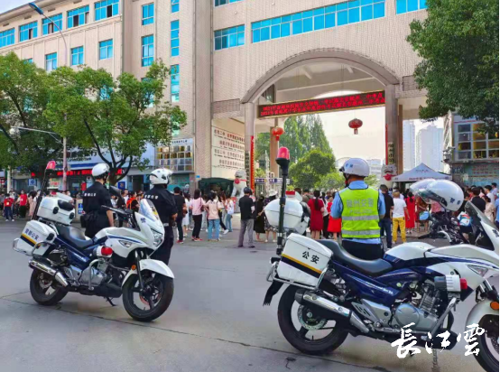 随州市二中考点现场执勤交警说:“今天我们出动了全部警力,分成引导组、考点组、路面秩序组、后勤保障组,大家各司其职,全方位为广大考生服务。
