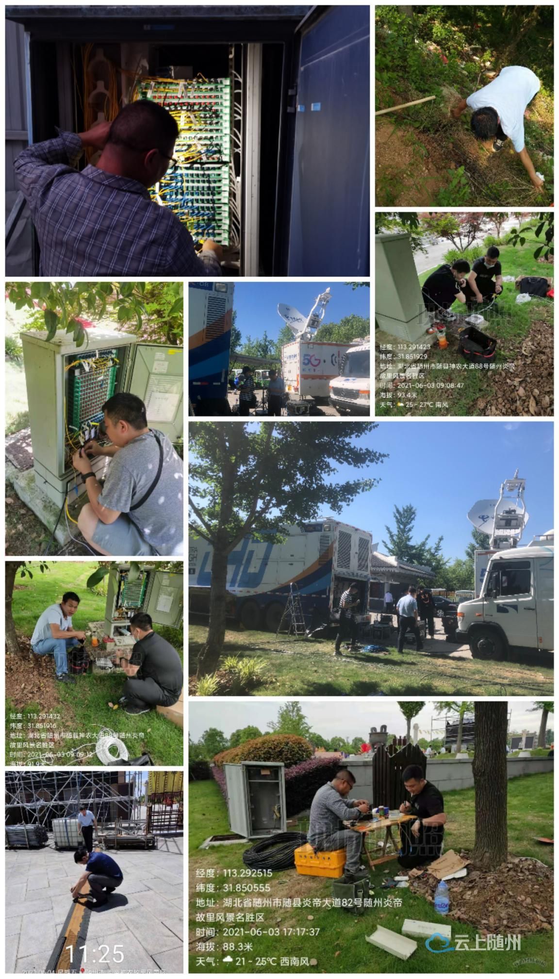 随县分公司网络部早安排,早部署,于5月31日进入会场进行布置,顶着烈日在主、分两个会场对所需的网络及各项通信线路进行调测,共开通六条固定IP,两条专线电路,两条公安监控网络,四部固定电话。寻根节当天,在市公司无线网优中心、政企客支中心及线路中心等同志的大力支持下,凌晨5点随县分公司即组织巡线人员在重要通信节点现场巡逻保障,同时对主分会场现场人员同步到位实施网络保障,为中央电视台直播车、湖北卫视、随州广播电视台、随州公安及会场大屏、淮河分会场提供了直播服务保障。