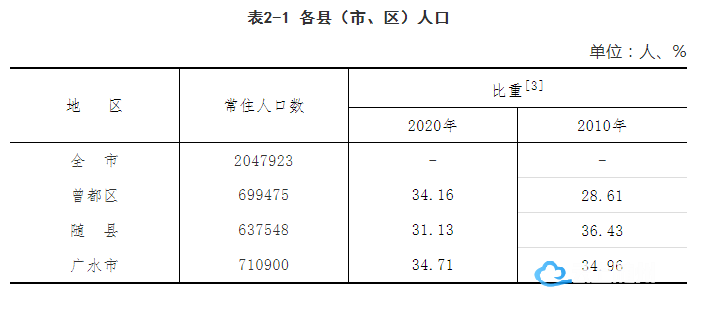 曾都区常住人口699475人,占全市常住人口比重为34.16%;随县常住人口637548人,占全市常住人口比重为31.13%;广水市常住人口710900万人,占全市常住人口比重为34.71%。