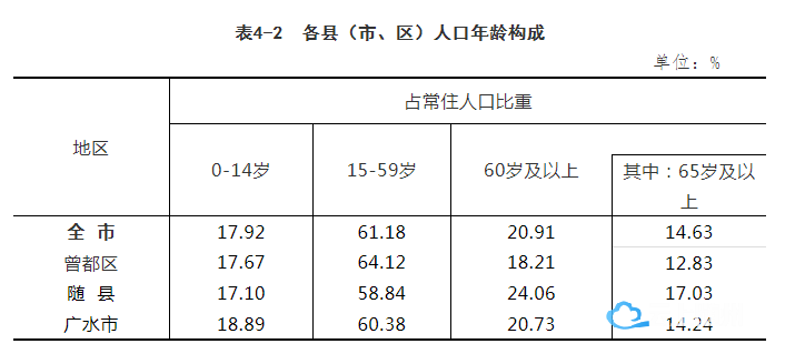 曾都区65岁及以上人口比重为12.83%,随县65岁及以上人口比重为17.03%,广水市65岁及以上人口比重为14.24%。
