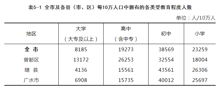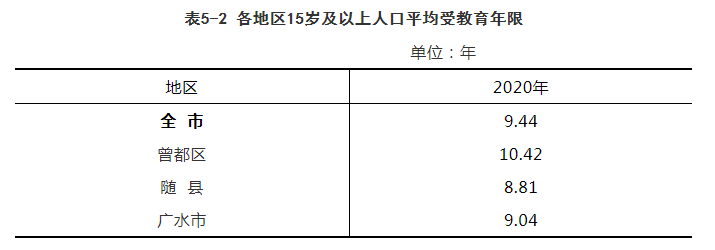 曾都区常住人口平均受教育年限为10.42年,随县常住人口平均受教育年限为8.81年,广水市常住人口平均受教育年限为9.04年。