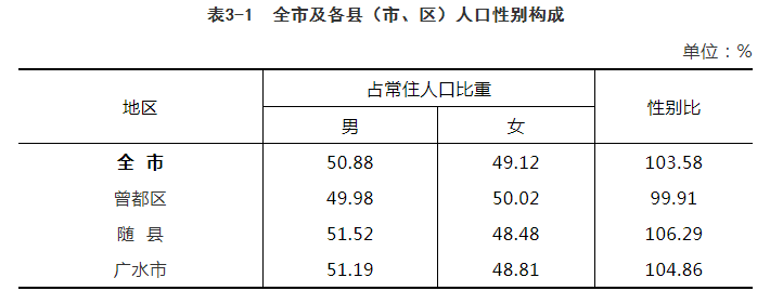 曾都区常住人口性别比为99.91,随县常住人口性别比为106.29,广水市常住人口性别比为104.86。