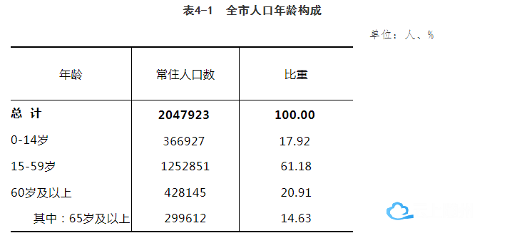 全市常住人口[2]中,0-14岁[3]人口为366927人,占17.92%;15-59岁人口为1252851人,占61.18%;60岁及以上人口为428145人,占20.91%,其中65岁及以上人口为299612人,占14.63%。与2010年第六次全国人口普查相比,0-14岁人口的比重上升4.09个百分点,15-59岁人口的比重下降11.29个百分点,60岁及以上人口的比重上升7.21个百分点,65岁及以上人口的比重上升5.47个百分点。