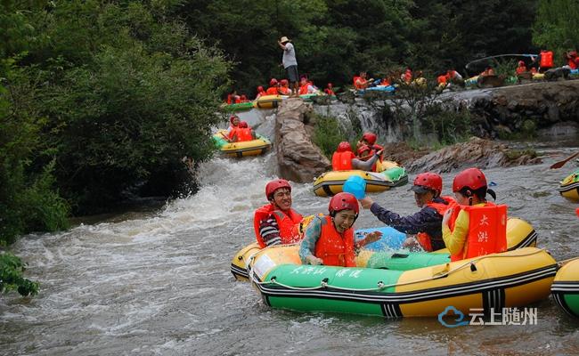 大洪山漂流全长4000多米,落差70余米,多处冲浪刺激点,让人惊险刺激,回味无穷。沿途有“瓜果迷香”、 “花香迷人”、 “旋流迷醉”、 “丛林迷宫”、 “雨林迷茫”、 “幽谷迷恋”、 “暗河迷途”、 “森林迷雾”等八大景观带,三十多处景点。漂流沿河两岸怪石峥嵘,花木繁茂,鸟鸣蝶舞,“异石尽含千古秀,奇花独占四时春”。 景色如画的自然生态环境与人文景点交融,让人陶醉,为游客带来无穷的观赏性、刺激性和挑战性。当您坐上双人橡皮艇,漂入河中,你便会感受惊险刺激的乐趣,体味“激流勇进浪上漂,青山绿水画中游”的意境。