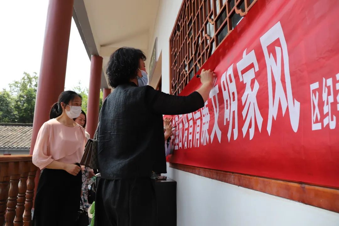 活动中,来自全区的党政主职干部家属及女干部代表,参观九口堰新四军第五师纪念园,开展党史学习教育现场教学。观看红色教育主题片、警示教育片,以PPT的形式展示文明家风家庭,分享红色家风故事,签订家庭助廉承诺书,发出家庭助廉倡议。全方位、多层次压实家庭助廉责任链条,形成社会、单位、家庭共同监督管理合力,让全区广大党员干部家庭从红色家风故事和百年党史中感悟信仰力量,以红色家风培育清廉文明家风,助力“四区”建设,唱响新时代“听党话、感党恩、跟党走”主旋律。
