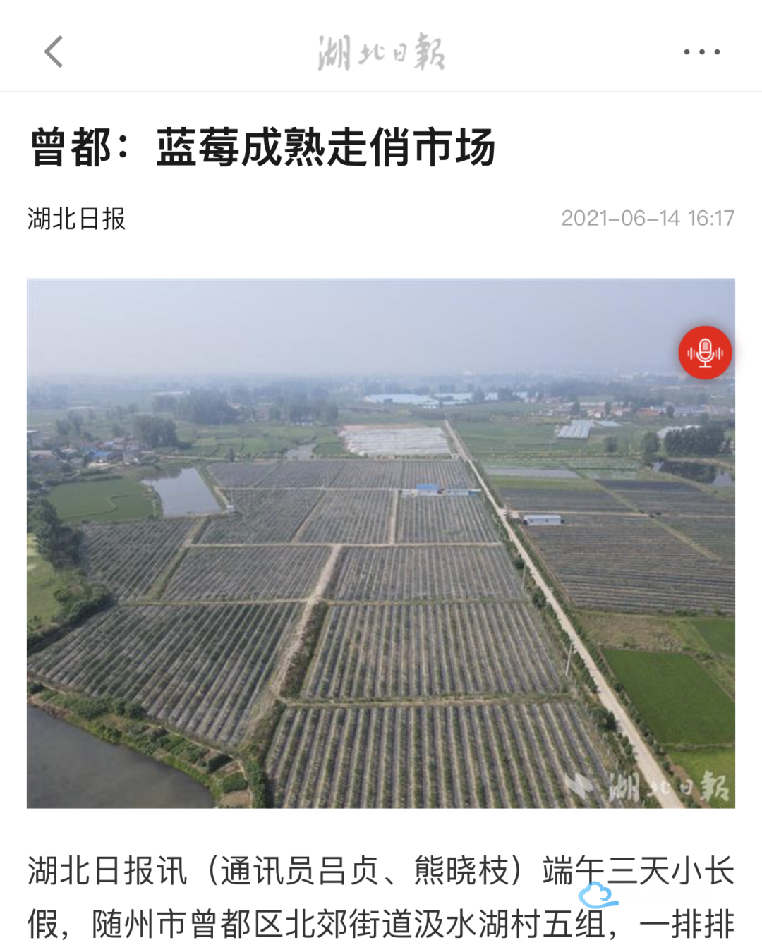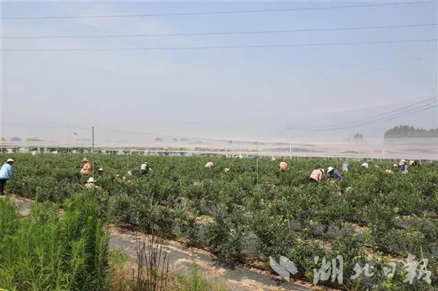 端午三天小长假,随州市曾都区北郊街道汲水湖村五组,一排排蓝莓树整齐排列,茂盛的枝叶向四面展开,像一把把撑开的绿色小伞,蓝莓一串串错落有致的挂在绿叶下,犹如一个个“蓝精灵”,村民们忙着采摘、冷却、分级、装盒、称重、装箱,一派忙碌。