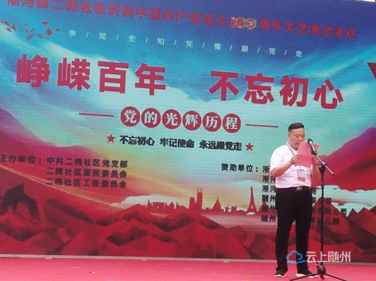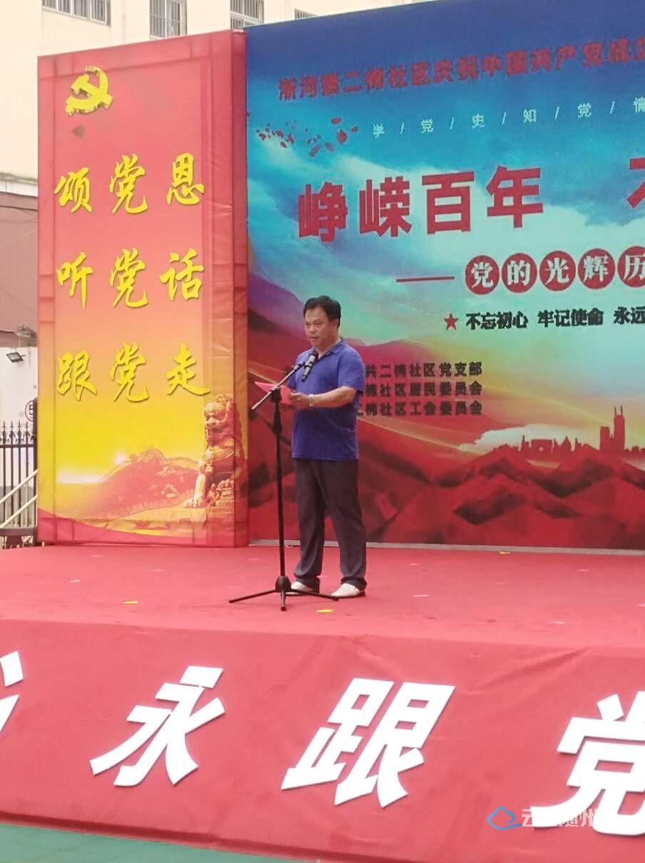 放歌抒心声,歌舞庆华诞。近日,淅河镇二棉社区举办“峥嵘百年 不忘初心”建党100周年大型文艺汇演。参加此次活动的领导有高新区工会常务副主席黄刚书、淅河镇党委书记李福银等。李福银在活动上讲话。淅河镇二棉社区党支部书记李昌发热情致辞。
