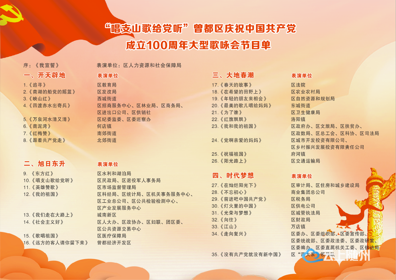 为隆重庆祝中国共产党成立100周年,从党的百年伟大奋斗历程中汲取继续前进的智慧和力量,由中国共产党成立100周年曾都区庆祝活动暨党史学习教育领导小组主办,中共随州市曾都区委组织部、中共随州市曾都区委宣传部、随州市曾都区文化和旅游局、随州市曾都区融媒体中心承办的“唱支山歌给党听”——曾都区庆祝中国共产党成立100周年歌咏晚会即将激情开唱。此次活动分“开天辟地”“旭日东升”“大地春潮”“时代梦想”四个篇章,以歌咏的形式,展示中国共产党奋斗、奋发、奋进的光辉历程,唱响曾都人民心向党、跟党走、担使命、开新局的昂扬旋律,凝聚人心、鼓舞斗志,激励全区广大党员干部进一步增强“四个意识”,坚定“四个自信”,做到“两个维护”,凝聚全区人民奋力建设专汽之都核心区、现代农港引领区、城乡融合样板区、社会治理示范区的精神力量,推动曾都高质量发展。