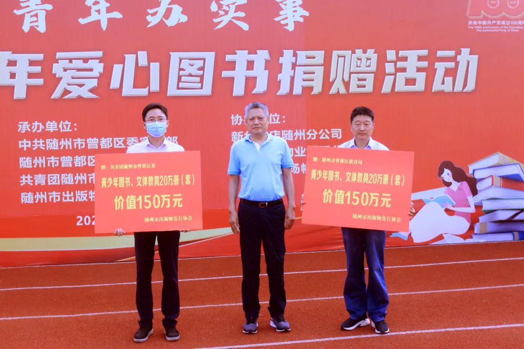 活动中,新华书店随州分公司、湖北博瑞德文化传播有限公司、湖北聪贝文化传播有限公司、湖北海韵文化传媒有限公司、湖北先锋文化传媒有限公司、湖北梯田文化传播有限公司、湖北猎豹图书文化有限公司、湖北世纪华章文化传播有限公司、湖北一心文化发展有限公司、湖北远成文化传播有限公司为全区青少年捐赠各类图书、文体教具45万册(套),总价值300万元。