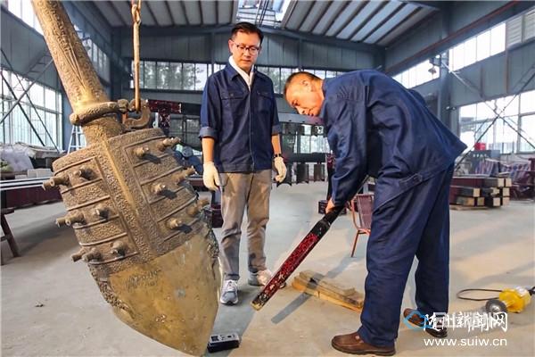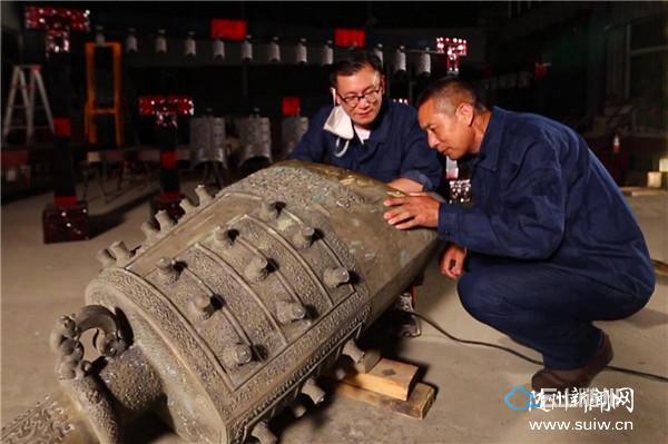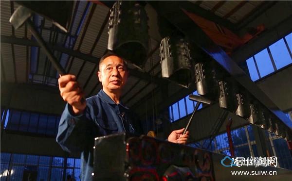 青铜编钟制作技艺是我国传承千年的传统“陶范铸造工艺”,即将科学配比后的铜、铅、锡青铜金属熔液浇铸入预先制好的陶质编钟铸型中,经冷却凝固后,进行清理、打磨、校音,使其成为青铜编钟的工艺过程。图为国家“编钟“乐器行业标准制定首席专家、国家级高级技师、非遗青铜编钟制作技艺代表性传承人项绍清,正在对新制作的编钟进行一钟双音校音。