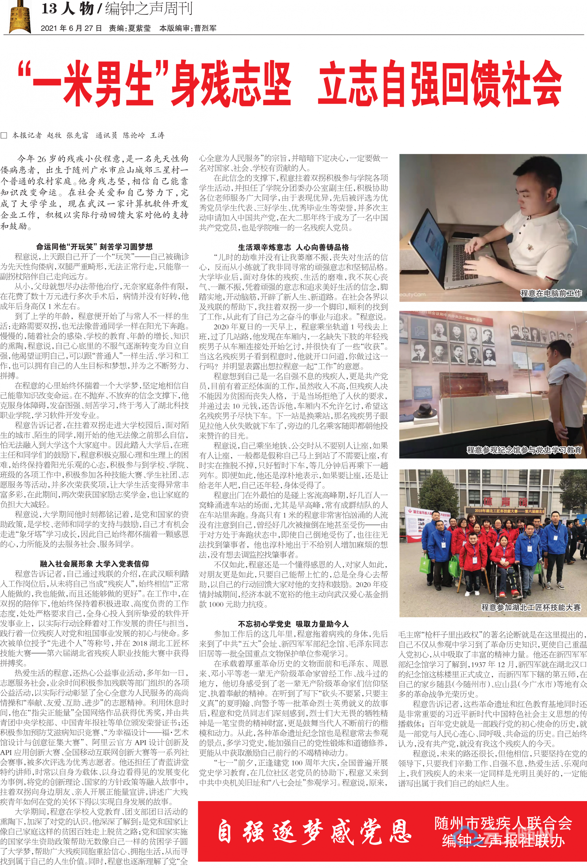今年26岁的残疾小伙程意,是一名先天性佝偻病患者,出生于随州广水市应山城郊三星村一个普通的农村家庭。他身残志坚,相信自己能靠知识改变命运。在社会关爱和自己努力下,完成了大学学业,现在武汉一家计算机软件开发企业工作,积极以实际行动回馈大家对他的支持和鼓励。